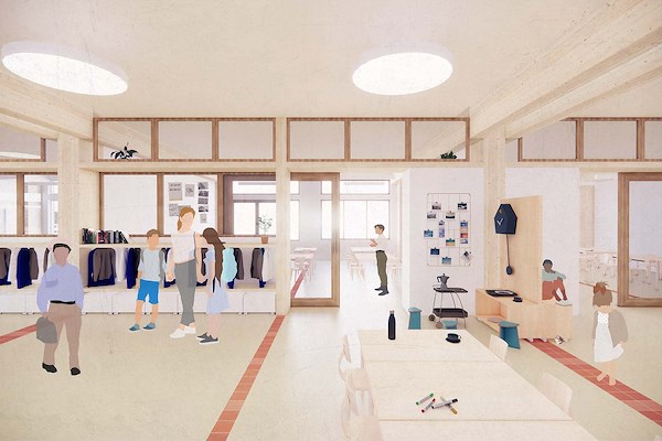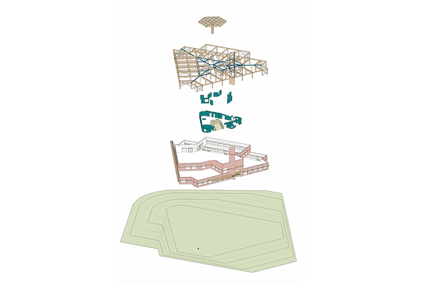 Het gebouw heeft van binnen een driehoekige plattegrond die rationeel is qua constructieve opzet. Door de herhaling van constructieve elementen wordt een duurzame houtbouw constructie betaalbaar en haalbaar. Bij binnenkomst zijn er doorkijkjes naar de verschillende activiteiten in het gebouw, zodat je je direct welkom voelt. Langs een brede boulevard liggen de ontmoetingsruimtes van het kindcentrum geclusterd. De kookstudio, de tribunetrap, de bibliotheek en het speellokaal zijn op laagdrempelige manier aan elkaar verbonden. Op de begane grond liggen langs de gevel alle groepsruimtes van kinderdagverblijf en school. Op de verdieping is een open leerlandschap rond een constructieve houten ‘boom’. Aan de randen zijn de verschillende thuisbasissen van de bovenbouw en concentratie werkplekken. Vides bij de boom en tribunetrap geven speelse doorzichten naar de begane grond. De bovenbouw heeft richting het westen een groot leerterras met twee buitenlokalen. Het leerterras heeft een buitentrap die verbinding maakt met de groene speelomgeving op het maaiveld.