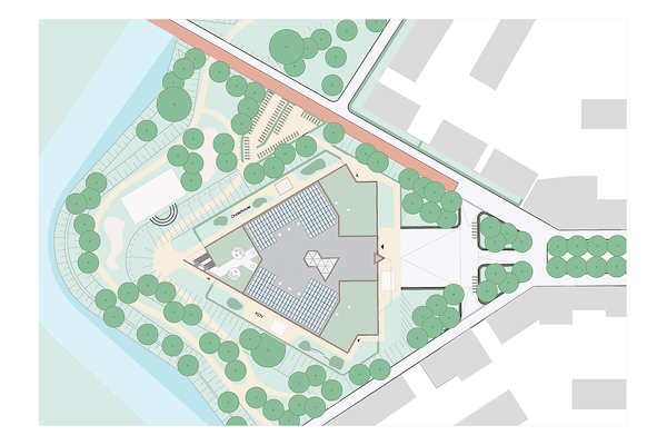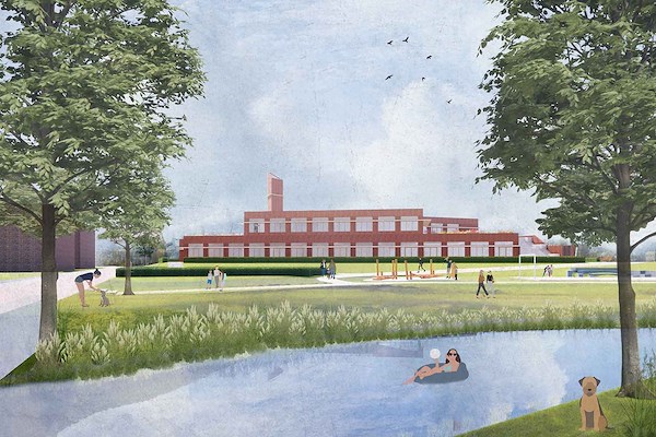 ZOETMULDER ontwerpt in samenwerking met Open Muur IKC Meeroevers: een alzijdig, herkenbaar en iconisch kindcentrum in de nieuwste wijk van Meerstad. Het robuuste rode gebouw is zowel hedendaags als tijdloos in uitstraling. Het horizontaal belijnde volume wordt met zijn verticale torenaccent een letterlijke referentiepunt in de wijk. We hebben ons hierbij laten inspireren door de bekende Groningse Bouma-scholen. Verder is de school op een ophoging geplaatst en krijgt zo een prominente positie in de wijk, zoals een oud Wierdedorp. Het hoogteverschil vormt rond de school een uitdagende ruimte voor landschappelijke spel- en leeractiviteiten.