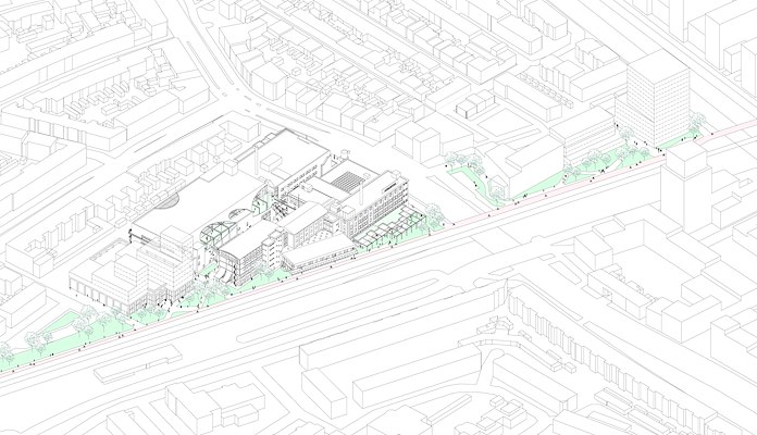 Een bestaand keldernetwerk wordt hergebruikt voor fietsenstallingen en infrastructuur, waardoor het oppervlak vrij blijft voor voetgangers en openbaar leven. Fietsroutes sluiten rechtstreeks aan op het nabijgelegen treinstation en het stedelijk weefsel.