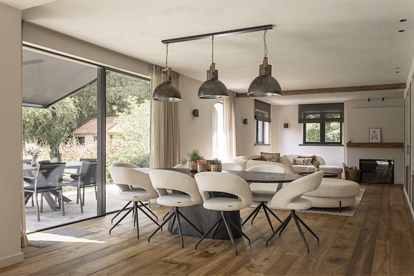 Een belangrijk onderdeel van het interieurconcept is de integratie van twee EuroCave wijnkasten, subtiel ingebouwd in een maatwerk ombouw in de leefruimte. De wijnkasten vormen niet alleen een functioneel element, maar dragen actief bij aan de sfeer en uitstraling van het interieur.