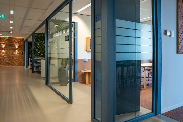 Voor de glaswanden is gekozen voor de IM WoodFrame Slim Oak wanden. De systeemwandprofielen zijn gemaakt van reststromen eikenhouten lamellen. Deze zijn afkomstig uit Europese FSC-gecertificeerde meubelbedrijven. De gekozen kleurafwerking is Aurora Blue.