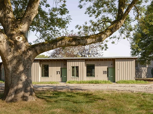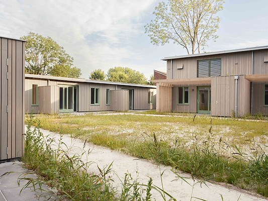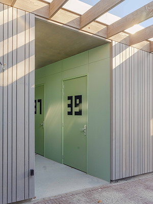 MEERGENERATIEHOFJE MET SOCIALE HUURWONINGEN Voor de locatie van het gesloopte bejaardenhuis Nij Nittersum in Stedum ontwierp Specht architecten veertien aardbevingsbestendige sociale huurwoningen. Opdrachtgever was woningcorporatie Wierden en Borgen. De inwoners van het Groninger wierdedorpje hadden een belangrijke stem in wat het moest worden. Er was behoefte aan betaalbare huurwoningen voor starters en senioren. Beoogd neveneffect was de doorstroming binnen het bestaande woningenbestand in Stedum. Omdat de bestemming van de centraal gelegen locatie het hele dorp bezighield, begreep Specht goed dat er iets bijzonders moest worden ontworpen. Het bijzondere zit in de combinatie van een hofjesvorm, het groene karakter dankzij bomen, tuin en sedumdaken, en de keuze en toepassingswijze van materialen. De woningen zijn opgetrokken in houtskeletbouw en de gevels zijn bekleed met fraké noir: vormvast hout, afkomstig uit duurzaam beheerde bossen. Omdat het is voorvergrijsd, behoudt het zijn kleur. De nerf loopt verticaal, waardoor regenwater mooier afstroomt en het hout rustiger veroudert. Het geheel voegt zich zacht naar de omgeving, het paart eigenheid aan bescheidenheid.