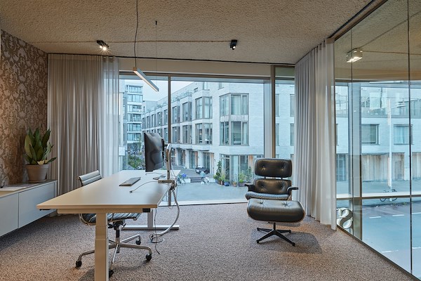 De werkruimtes zijn gecreeerd door middel van de iQ Single. Dit enkelglas, volglazen systeemwand onderscheidt zich door een zeer beperkt profielgebruik.
