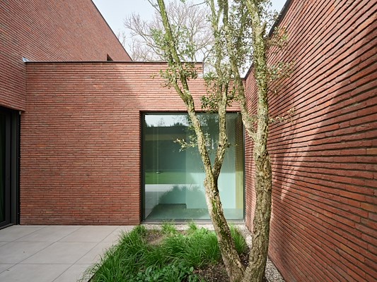 , een bezande genuanceerde gevelsteen geproduceerd volgens de handvorm-methode. De keuze voor deze elegante baksteen in het Hilversums formaat is zorgvuldig gemaakt. Door het gebruik van grote vlakken metselwerk was het belangrijk om een gevelsteen met een verfijnde materialiteit toe te passen. In combinatie met de verwerking, stootvoegloos, in wildverband en met een teruggestreken lintvoeg, behoudt het oppervlak een levendige gelaagdheid. Dankzij de Hand-Made productietechniek heeft deze gevelsteen een krachtige, natuurlijke nuance. De roodbruine toon van de steen, een natuurlijk verkregen kleur tot in de massa, vormt een subtiele verwijzing naar het oorspronkelijke kleurenpalet van de omliggende jaren ’30 villa’s. Dit zorgt voor een vanzelfsprekende aansluiting bij het straatbeeld, terwijl het formaat en de verwerking een eigentijdse twist geven.