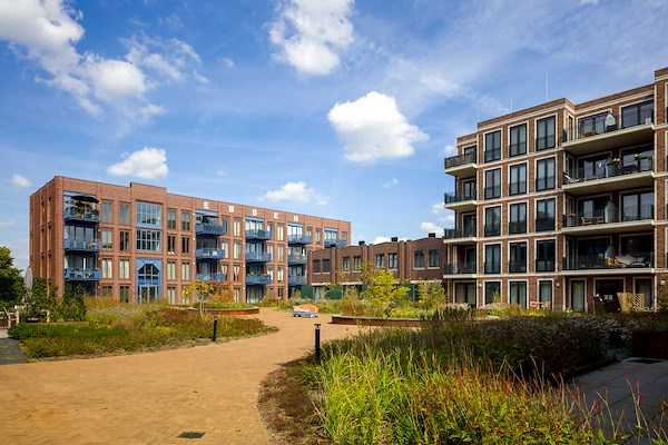 Een belangrijke vraag voor architecten|en|en was daarnaast: hoe zorgen we dat in de appartementen in de tweede linie vanaf het water ook de kwaliteit van de omgeving wordt ervaren? Joost: “Een voordeel is dat de parkeergelegenheid onder een verhoogd maaiveld is gerealiseerd. Hierdoor wordt het zicht aan de oostzijde niet belemmerd door de supermarkt. Daarnaast bood het ons de gelegenheid om brede trappartijen te maken aan de westkant. Deze verbinden de hele wijk met het kanaal. Door er een ‘straatbalkon’ aan toe te voegen, wordt het bovendien extra de moeite waard om hier even stil te staan.”