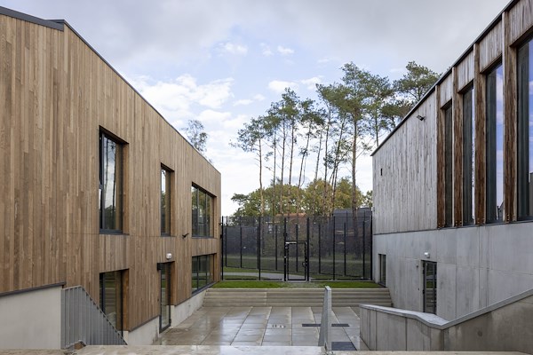 Bewegen staat centraal op de campus; sport is onderdeel van het dagelijkse programma. Het sportgebouw met sporthal, fitnessruimte en dojo profiteert van veel daglicht. Het is een compact gebouw met een slimme organisatie die ervoor zorgt dat jongeren niet door lange gangen moeten lopen en begeleiders eenvoudig toezicht kunnen houden op de sporters. Warmtepompen aan de achterzijde voorzien de campus van hernieuwbare energie. Naast de sporthal ligt het nieuwe onderwijsgebouw met ateliers voor hout- en metaalbewerking, een horecaklas en theorielokalen voor talentontwikkeling. Jongeren volgen tijdens hun verblijf namelijk ook onderwijs. Beide gebouwen zijn direct bereikbaar vanaf het centrale plein en liggen bewust lager om de kleinschaligheid van de campus te respecteren. De woongebouwen worden afgewerkt met rode baksteen, terwijl de sport- en onderwijsgebouwen houten geveldelen hebben. Zo ontstaat onderscheid binnen het ensemble en wordt duurzaam, natuurlijk materiaal toegevoegd.