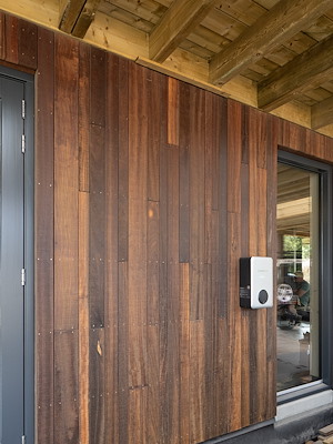 Voor de buitenafwerking is gekozen voor Padoek, een Afrikaanse hardhoutsoort met een opvallende roodbruine kleur en duurzaamheidsklasse 1. Het hout vergrijst gelijkmatig in de tijd, maar behoudt zijn kwaliteit, waardoor het geschikt is voor onbeschermde gevels. De bekleding is aangebracht op een onderconstructie van Steico Universal binnen een houtskeletbouwsysteem met robuuste staanders en liggers.