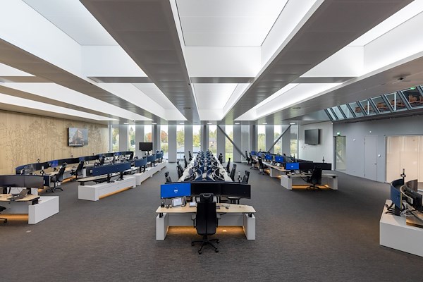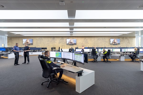 Het ‘command and control centre’ bevindt zich op de eerste verdieping van het gebouw parallel aan de Europaweg, met noodzakelijke installaties eronder en ernaast. De cortenstalen gevel heeft onopvallende ventilatiespleten en drie verlichte logo’s bij de entree. Binnen is er een open trap die de drie verdiepingen verbindt, met informele zones op elke verdieping voor overleg en pauzes. De kleurstelling van het interieur bevordert de oriëntatie en draagt bij aan het gevoel van veiligheid. Politie, Ambulancezorg en Brandweer werken samen en delen faciliteiten, hoewel kantoorruimte per dienst is toegewezen. Het interieur is afgestemd op intensief gebruik door vijftig centralisten, met aparte briefingruimtes en voorzieningen voor personeel in opleiding.