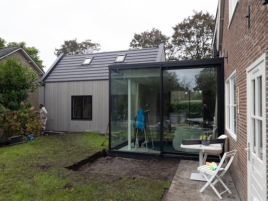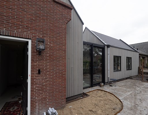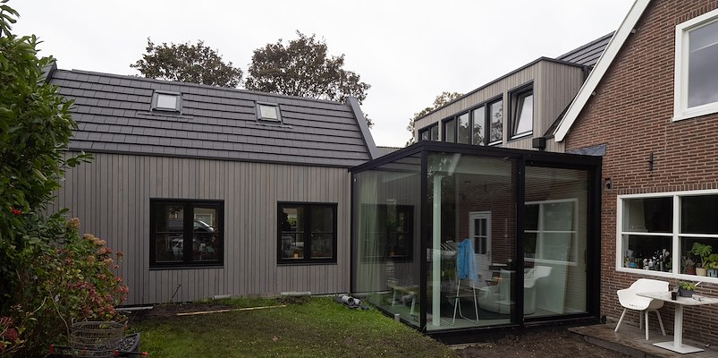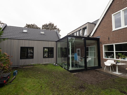 In Baambrugge realiseerde MGK Bouw een ingrijpende renovatie waarbij een nieuwe woning is geïntegreerd in een bestaand pand. Alleen de oorspronkelijke voorgevel en het achterhuis bleven behouden; daartussen is een volledig nieuwe, goed geïsoleerde woning gebouwd. Het ontwerp is van Enzo Architecten uit Burgerveen.