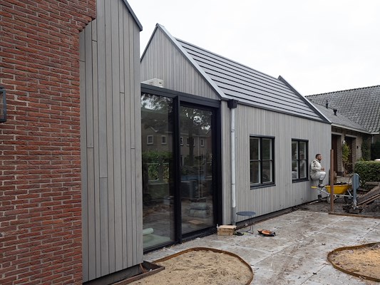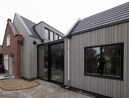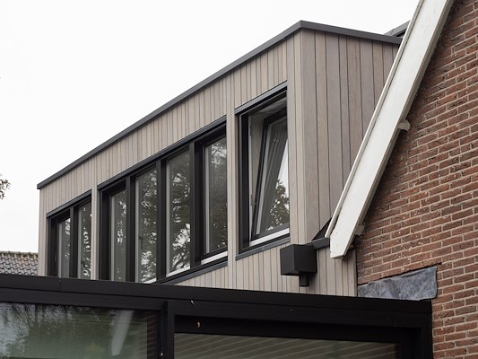 Voor dit project leverde Houthandel van Dam Fraké Noir in drie breedtes (75, 100 en 125 mm). Het hout is verticaal gesorteerd en strak gemonteerd, waardoor een rustig, ritmisch en verfijnd gevelbeeld ontstaat. Vooraf is een voorvergrijzer aangebracht om kleurverschillen te minimaliseren en een gecontroleerde, gelijkmatige veroudering te bevorderen.