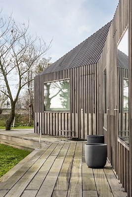 Het gebruikte Fraké Noir® is FSC-gecertificeerd en afkomstig uit duurzaam beheerde bossen. Fraké Noir® biedt uitstekende mogelijkheden om prachtige, eigentijdse houten gevels te realiseren, met een breed scala aan mogelijke ontwerpen en behandelingen. Dankzij de thermische modificatie heeft Fraké Noir® een hoge natuurlijke duurzaamheidsklasse, waardoor het uitstekend bestand is tegen de weersomstandigheden die kenmerkend zijn voor ons klimaat. Naast gevelbekleding wordt Fraké Noir® ook vaak gebruikt voor het bekleden van plafonds, bergingen, tuinconstructies en geluidsschermen.