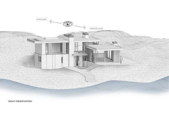 De architectuur combineert strakke horizontale lijnen en lange overstekken met grote glasvlakken, subtiel geïnspireerd door de jaren ’60. Zorgvuldig ontworpen interieurdetails, duurzame en natuurlijke materialen zorgen voor een moderne warme uitstraling. Houten gevels en natuursteen vormen een harmonieuze verbinding met de omgeving. Het resultaat is een villa die de rust van het duinlandschap omarmt en tegelijkertijd een eigentijdse, luxe leefomgeving biedt: een plek om volledig in te ontspannen en de natuur te ervaren.
