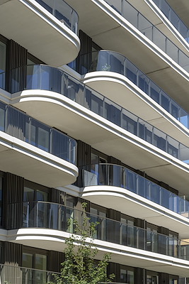 Bij het Olympiade-project in Amstelveen hebben wij het hekwerk op de balkons verzorgd, dat een mooie toevoeging is aan de sculpturale en afgeronde vormen van de urban villa’s. Deze balkons, uitgevoerd in wit beton met glazen hekwerk, creëren een speels contrast met de overige gebouwen. De schuine vormen en verspringingen in de balkononderbreking zorgen voor een dynamisch aanzicht, en ons hekwerk versterkt deze esthetiek perfect.