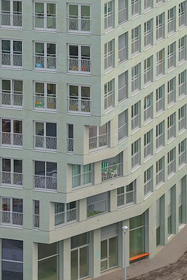 Dezelfde steen is met een geglazuurde afwerking toegepast in de bites, wat een lichtspel creëert dat de entrees benadrukt. De contrasterende balustrades maken het mogelijk alle ramen volledig te openen en geven het gebouw tegelijk een warmere uitstraling van een woongebouw.