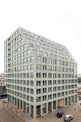 We hebben gekozen voor één blauwgroene, geëngobeerde baksteen, die Octavia Hill een zachtere, zijdeachtige reflectie geeft. Het toepassen van de stenen in een koppenverband en de gelijkmatige verdeling van ramen en penanten over de gevels maken Octavia Hill een abstract object.