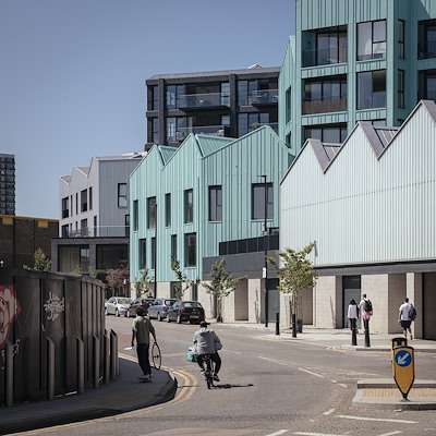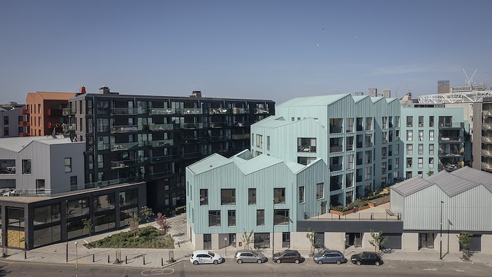 , ontworpen door dRMM, transformeert een braakliggend terrein tussen Hackney Wick en Fish Island tot een levendige, multifunctionele ontwikkeling. Het project combineert 175 woningen met 2.250 m² aan licht industriële en commerciële ruimtes, waarbij werkgelegenheid behouden blijft en de woondichtheid wordt verhoogd. Het robuuste materiaalpalet—baksteen, metaal en glas—verwijst naar het industriële erfgoed van de omgeving, inclusief gevels van GreenCoat® Pro BT colorcoat staal in de kleur