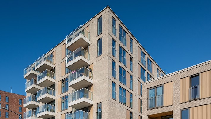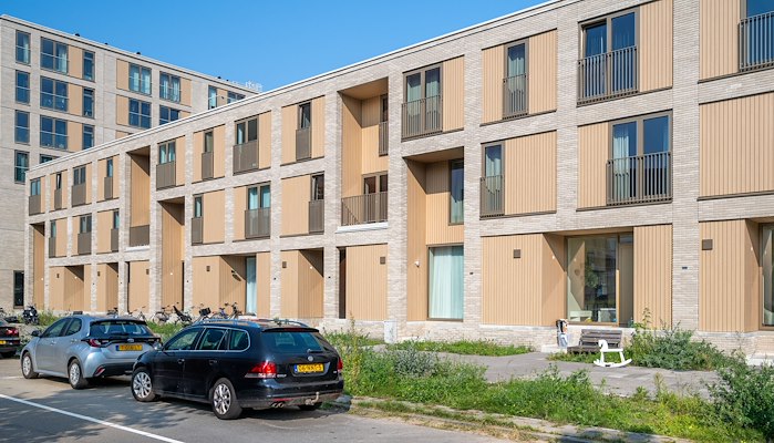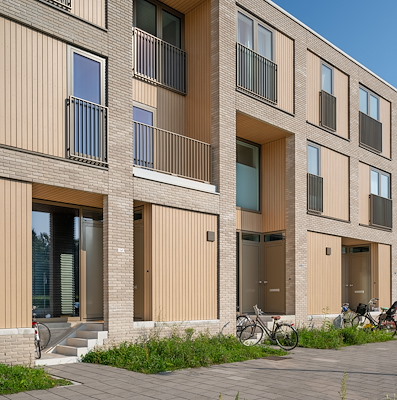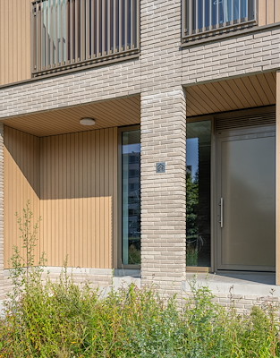 Het gevelraster is uitgevoerd in een lichte baksteen, met aluminiumkozijnen en glas of gevelbekleding van Rockpanel Woods. Een materialisering die ook de andere twee gebouwen siert. Mees vertelt: “We wilden deze stedelijke plek een verzachting meegeven. Zeker omdat er ook eengezinswoningen tussen zitten. Een volledig stenen gevel is te hard en ongenaakbaar.”