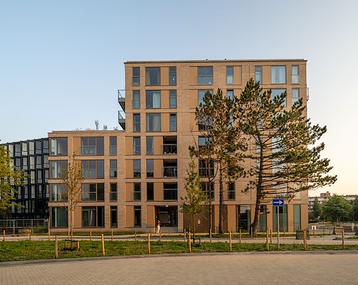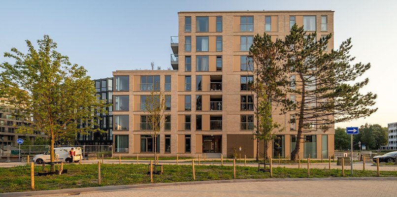 Het middelste gebouw vormde een uitdaging. “Tussen beide appartementenblokken lag een plan voor grondgebonden woningen. Maar hoe combineer je die kleinschaligheid effectief met de locatie, een drukke verkeersader?”