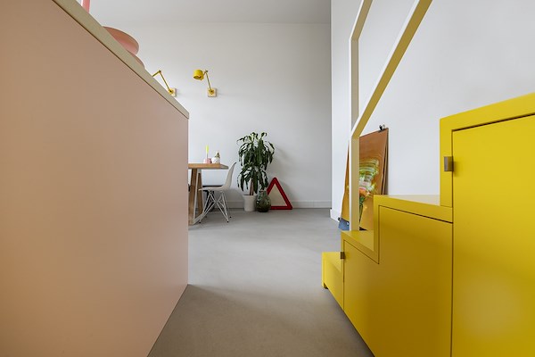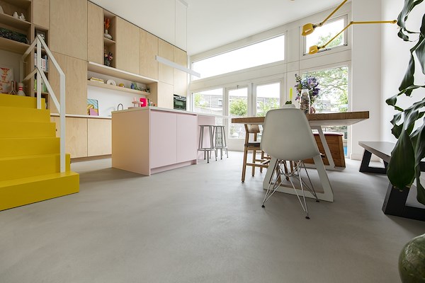 In een project in Den Bosch vormt de vloer het verbindende fundament voor een uitgesproken interieur. Waar de bewoners kozen voor gedurfde accenten — zoals een roze kookeiland en een gele trap — fungeert de Premium Leef-Beton vloer als het rustpunt dat de verschillende ruimtes met elkaar verbindt.