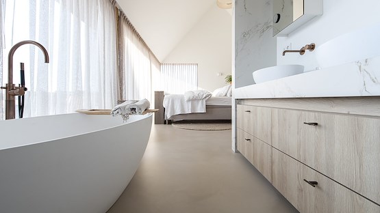 De kracht van dit project zit in de eenheid. De vloer verbindt alle leefruimtes en loopt zonder drempels door in de badkamer en de inloopdouche. Dit zorgt voor een rustig beeld en een ruimtelijk effect, wat het luxe gevoel in de woning versterkt.