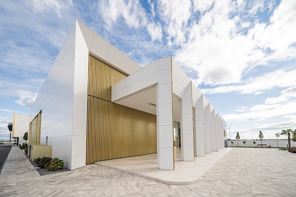 Surrounding the complex, white marble floor slabs bestow a touch of Mediterranean elegance. In addition, the cladding on the two event halls features white ceramic panels, offset by slatted golden sections and window elements. Vertical slats made of lacquered aluminium profiles appear here and there on the building, both in the black window frames, and in gold details. They break up the flat façade and lend it a certain contemporary lightness. A lightness to be shared and experienced by guests at the hotel.