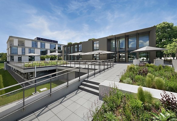 The site itself is designed in harmony with its environment: the new buildings are set on a shared platform, which almost completely conceals the underground car park below. There are views in all compass directions from the patios and generous glass frontages: up to the wooded hillsides, down to the dam in the river. Landscape and architecture intermingle, making the campus feel more spacious and giving it a stronger sense of being rooted in the landscape.