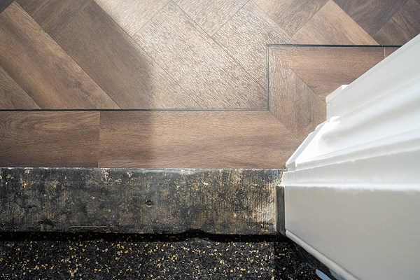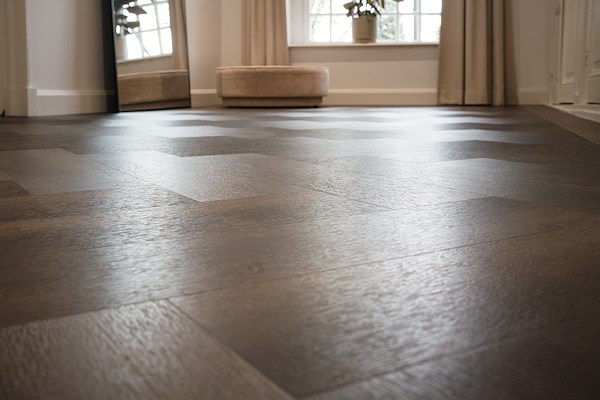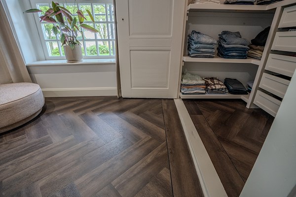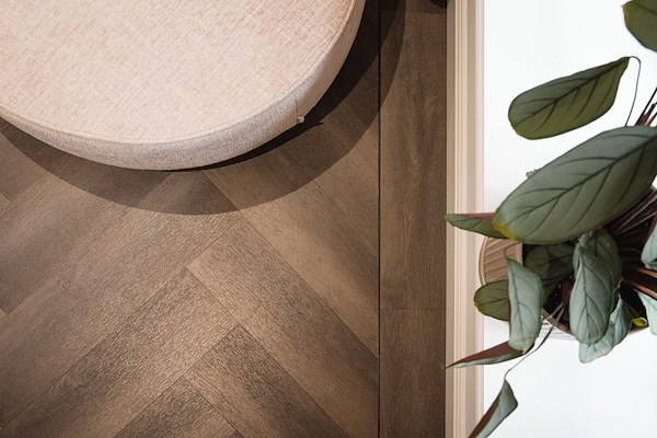 is modern en toch tijdloos elegant met zijn donkere, natuurlijke houtlook in visgraatmotief. Beide designvloeren zijn niet alleen een visuele blikvanger, maar ook duurzaam en gemakkelijk te onderhouden.