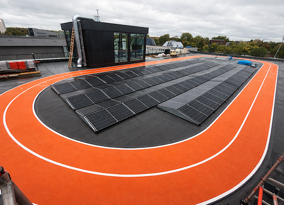 Het BIS-systeem zorgde voor een stabiele en belastbare opbouw op het bestaande dak, terwijl het BTS-P systeem een waterdichte, slijtvaste en antislip toplaag vormde. Dankzij de scheuroverbruggende eigenschappen van het systeem kon de baan veilig worden toegepast op de dakconstructie, zonder risico voor de onderliggende waterafdichting. De gekozen oranje kleur maakte de fietsbaan duidelijk zichtbaar en versterkte het atletiekbaan-achtige karakter.