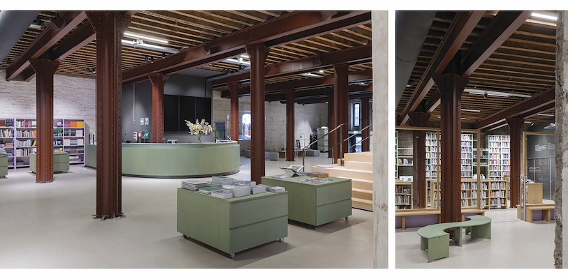 De vaste inrichting introduceert een frisse interpretatie van dit kleurenpalet in lavendel en mintgroen. Aanvullende materialen als eiken, honey-pine en staal sluiten aan bij de logica van het gebouw. De baliebladen bestaan uit een naadloze gietvloer met granulaat van gerecycled plastic, waarvan de kleuren verwijzen naar de historische menietinten.