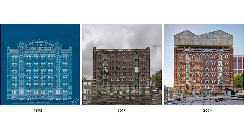 De nieuwe sculpturale kroon herstelt dat idee met een eigentijdse interpretatie van de ooit kenmerkende contour. Het nieuwe volume ontstaat door gevouwen vlakken, waarvan de hoge punten aansluiten op de verticale middenassen van de voormalige lierhuizen. De oost- en westgevels zijn rustiger van opzet, passend bij de massieve uitstraling van het pakhuis.