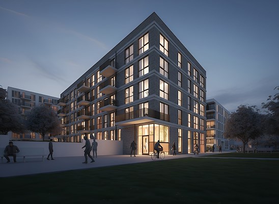 Blok E bevindt zich in het groene binnengebied. Het lichtgrijs gemêleerde metselwerk wordt doorbroken door horizontale betonbanden die elegant doorlopen in de balkons. Donkerbronzen kozijnen en hekwerken geven het gebouw een stoere en moderne uitstraling.