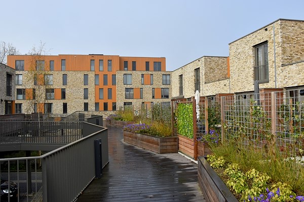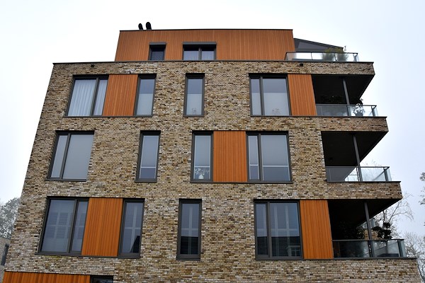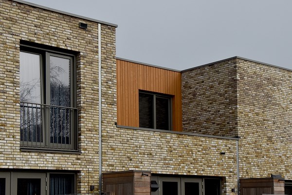Met woningen die zijn uitgevoerd in een uniforme steenkleur en variërende dakhoogtes, ontstaat een harmonieus en samenhangend straatbeeld. Alle appartementen en waterwoningen genieten van een vrij uitzicht over het water, wat de woonbeleving verrijkt. De gevels zijn bekleed met geborsteld Vuré Noir hout, afgewerkt met Sansin Enviro Stain SDF 150921-0 en Flame Delay PT. Deze hoogwaardige afwerking combineert een verfijnde esthetiek met verbeterde duurzaamheid, waardoor het hout optimaal beschermd wordt tegen weersinvloeden.