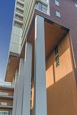 Bij het ontwerpen van de woningen stond de kwaliteit van het wonen aan een binnenhaven centraal. Dit is tot uiting gebracht door het gebruik van veel glas en buitenruimtes. Daarnaast is er bewust gekozen voor het gebruik van houten gevelbekleding, waarbij er bij dit project specifiek is gekozen voor Oregon Pine. Houthandel Van Dam heeft in totaal meer dan 250m³ Oregon Pine gevelbekleding geleverd tijdens de bouw van de woontoren.