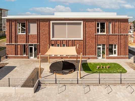Kindcentrum Hanzewijk is niet alleen zo circulair mogelijk gerealiseerd, maar ook energiezuinig en comfortabel. Dankzij een hoogwaardige thermische schil, royale overstekken en automatische zonwering blijft het binnenklimaat passief koel. Bodemwarmte, warmtepompen, warmteterugwinning en zonnepanelen maken het gebouw energieneutraal. Grote raampartijen en een centrale ontmoetingsruimte zorgen voor veel daglicht en een open, uitnodigende sfeer.
