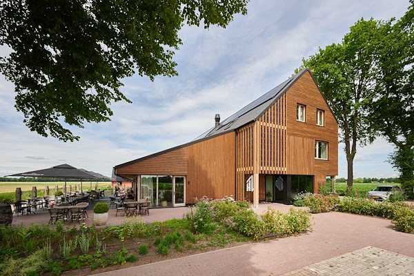 In het interieur is de houten en duurzame uitstraling voortgezet. Hoewel de basis is opgetrokken uit kalkzandsteen zorgt een eigentijdse houten gebintconstructie ervoor dat niet alleen in het restaurant, maar ook in de rest van het hotel de sfeer en charme van een Drentse schuur wordt ervaren. Door de toepassing van overstekken aan de zuidzijde wordt oververhitting voorkomen en blijven tegelijkertijd de zichtlijnen naar het landschap open. Zo is de openheid van de Drentse veenontginningen overal zichtbaar.