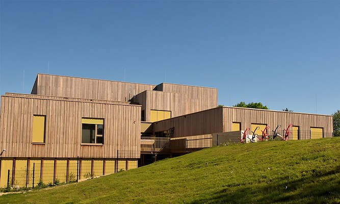 De gevel is bekleed met maar liefst 3.300 meter aan FSC®-gecertificeerd Fraké Noir. Het hout is behandeld met Flame Delay FX-Pro, een brandvertragend middel dat de veiligheid verhoogt zonder afbreuk te doen aan de esthetiek. Naarmate het vergrijst, krijgt het gebouw een steeds natuurlijker en ingetogener uitstraling.