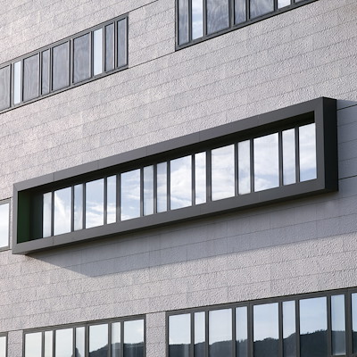 , waardoor een krachtig maar rustig gevelbeeld ontstaat. De afmetingen van de panelen zijn afgestemd op het ritme van de raamopeningen, wat de horizontale geleding van de gevel versterkt.
