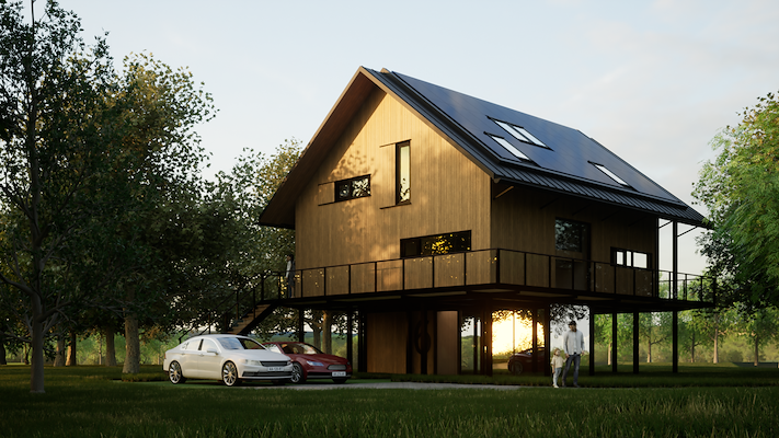 Voor de paalwoning kozen we voor een uitgesproken duurzame oplossing. De woning staat op een ranke stalen tafelconstructie, met een minimale footprint van circa 25 m² op maaiveld. Zo blijft ruimte voor water, natuur en doorzicht. Het hoofdvolume is uitgevoerd in CLT, met geïntegreerde zonnepanelen, warmtepomp en WTW-installatie.