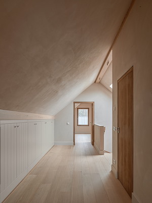Het huis is robuust opgezet, met brede doorgangen en heldere zichtlijnen. Ruimtes lopen in elkaar over, maar zijn door houten schuifdeuren wel van elkaar te scheiden. Het voelt hierdoor tegelijkertijd ruim en toch ook knus aan. In het hart van het huis is een haard, die de woon- en eetkamer van elkaar scheidt. Alle leefruimtes zijn op de begane grond. In het grotere volume zitten op de bovenverdieping gasten slaapkamers. In het lagere volume is de kap open gehouden, waardoor de eetkamer extra hoogte heeft.