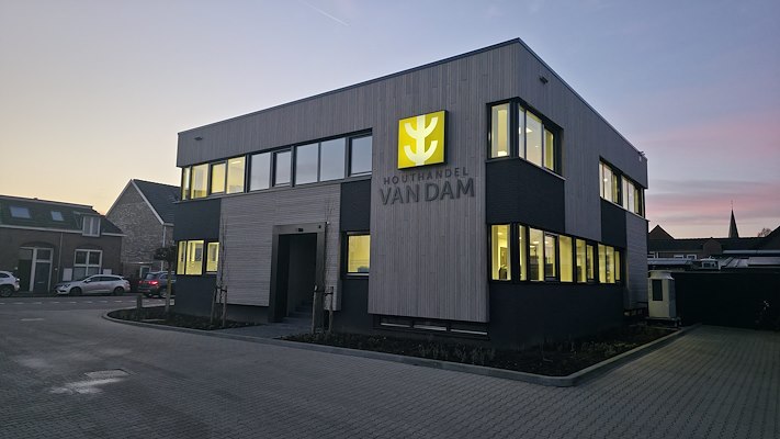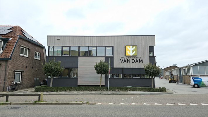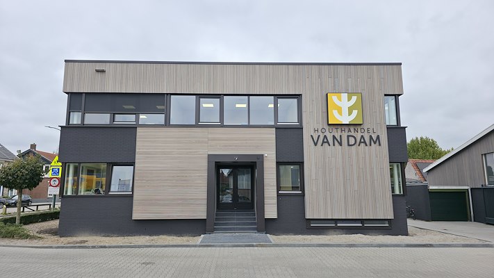 Bij de renovatie van het kantoorpand van Houthandel Van Dam is gekozen voor een hoogwaardige gevelafwerking met voorvergrijsd Fraké Noir, uitgevoerd met brandvertragende behandeling. In combinatie met het Noir FIX-CLIP systeem ontstaat een strak en eigentijds gevelbeeld dat aansluit bij de moderne identiteit van het bedrijf.