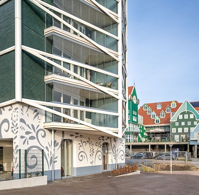 Het ontwerp van de Catharinatoren is een ode aan de Zaanse geschiedenis én een voorbeeld van slimme buitenruimteoplossingen in dicht stedelijk gebied. Architecte Liesbeth van der Pol liet zich inspireren door het beeld van een melkmeisje dat een juk draagt, waarbij de emmers sierlijk naar beneden bungelen. Deze beeldspraak is letterlijk vertaald in de architectuur: de balkons hangen als het ware aan tuien, gedragen door slanke maar robuuste kolommen—precies zoals het juk op de rug van het melkmeisje rust. Deze bijzondere constructie geeft het gebouw een onderscheidend silhouet en elegante uitstraling. De gevel is uitgevoerd in glanzend groene, geglazuurde bakstenen, die doen denken aan een traditionele Zaanse rok. Hiermee sluit het ontwerp naadloos aan bij het Zaanse mozaïek van vormen en kleuren.