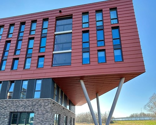 met strakke horizontale felsbanen. De warme roodtint van het colorcoat staal vormt een elegant contrast met het robuuste metselwerk dat de onderste geveldelen bekleedt. Deze combinatie van materialen benadrukt zowel duurzaamheid als verfijnde detaillering, waardoor het gebouw een duidelijke architectonische identiteit krijgt binnen zijn omgeving.