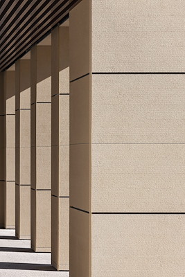 Het centrale blok is bekleed met panelen in de kleur P30 (bruin), vergelijkbaar met de oorspronkelijke zandsteenkleur. De horizontale gefrijnde textuur versterkt de continuïteit van het blok, gedefinieerd door de kruisvormige plattegrond.