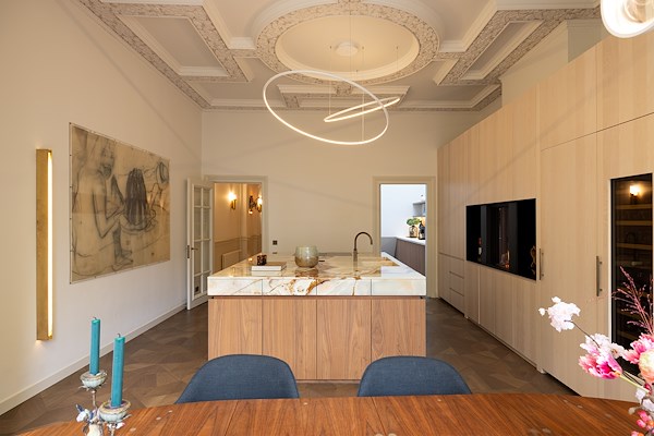 De woonkeuken aan de achterzijde vormt een harmonieus samenspel van klassieke en moderne elementen. Dankzij het uitzicht op de tuin en de royale lichtinval ontstaat een serene sfeer, midden in de stadse drukte. Ook andere ruimtes, zoals de werkkamer op de bel-etage en de rijk afgewerkte badkamer onder het dak, hebben elk een eigen identiteit gekregen waarin oud en nieuw subtiel samenkomen. Materialen als natuursteen en eikenhout worden gecombineerd met luxe behang, rijke stoffering en een zorgvuldig ontworpen lichtplan. Door de hele woning loopt een consistente lijn van elegantie, comfort en verfijning.