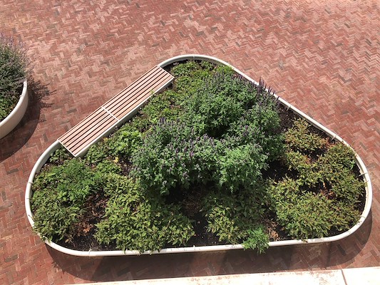 De combinatie van groen en zitgelegenheid zorgt voor een uitnodigende werkomgeving en maakt van het buitenterrein een verlengstuk van het kantoor.