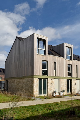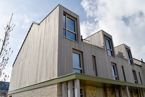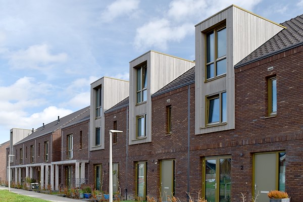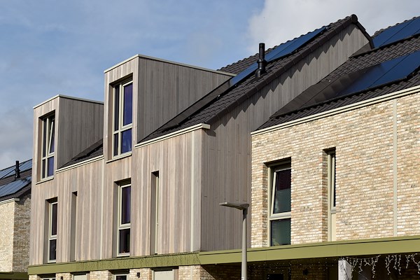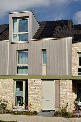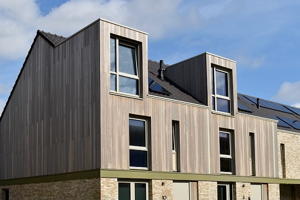 Binnen het project is bij diverse woningen gekozen voor Fraké Noir® gevelbekleding in model M shiplap. Het hout is afgewerkt met een woodsealer (ST-04), waardoor de natuurlijke uitstraling van het materiaal behouden blijft en tegelijkertijd bescherming wordt geboden tegen weersinvloeden. De toepassing van houten gevelelementen versterkt het eigentijdse karakter van de architectuur en zorgt voor een evenwichtige combinatie van natuurlijke materialen en moderne detaillering.