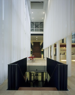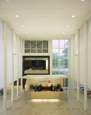 Voor het interieur van het Kluwer kantoor zijn kleurige losstaande cirkelvormige elementen ontworpen waarin diverse functies zoals pantry (blauw), kopieerruimte (roze) en patchruimte voor de computerkasten (geel) zijn ondergebracht. Naargelang de behoefte zijn –eveneens cirkelvormige- stilteruimten (grijs/bruin) en opslagruimten (groen) toegevoegd. De cirkels geven een extra herkenbaarheid en stevigheid aan de ruimte waarin aan de ene zijde werkbladen en flexplekken langs de gevel staan opgesteld en aan de andere kant kantoorruimten zijn aangebracht. Bij de centrale hal zijn boekentorens geplaatst met aan de buitenkant vakken waarin de nieuwe uitgaven van uitgeverij Kluwer getoond kunnen worden. Binnenin de torens is langs de wand een bank aangebracht met in het midden een tafelblad waaraan vergaderd kan worden of juist individueel gewerkt. In de rook- en barruimten en in het restaurant of de lounge kan ook vergaderd worden.