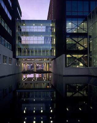 Naast de vier parallel opgestelde, in donkere handvorm steen uitgevoerde hoofdschijven, omvat het complex een transparant uitgevoerde restaurantruimte, een centrale hal en een rood, torenachtig volume, - een reactie op het verkeersplein. De kopzijden van de vier hoofdvolumes zijn visueel opgedeeld door kolommen in de vorm van witte schijven. Onderling zijn de volumes overdwars verbonden door transparante luchtbruggen. Als geheel heeft het complex een driehoekige vorm, waarbij de hoogste schijf een vooruitgeschoven positie inneemt en de hoek tegenover de stad markant opvult.