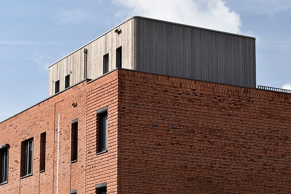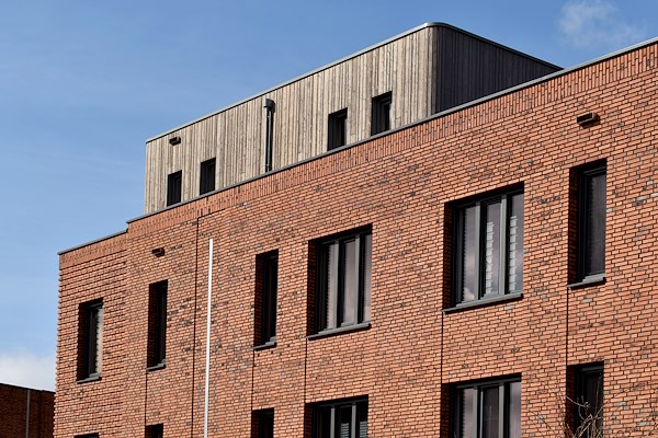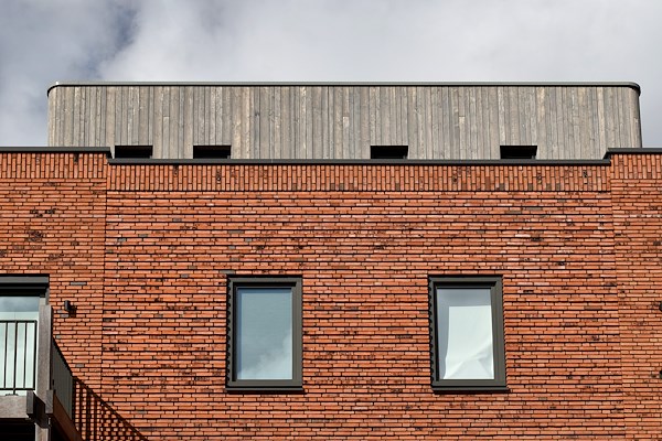 Het toegepaste Vuré Noir® is uitgevoerd in een geborstelde variant (model C), waardoor de zichtvlakken een subtiele reliëfwerking krijgen. De aanwezigheid van knoesten versterkt het karakter van het hout en draagt bij aan een levendig gevelbeeld. Het hout is afgewerkt met een hoogwaardige woodsealer en brandvertragend behandeld met Flame Delay SI, waarmee wordt voldaan aan de geldende brandveiligheidseisen en tegelijkertijd een duurzame bescherming tegen weersinvloeden wordt geboden.
