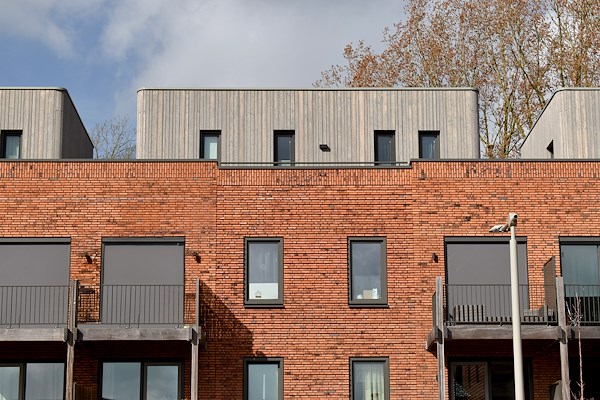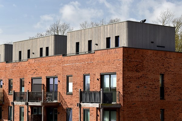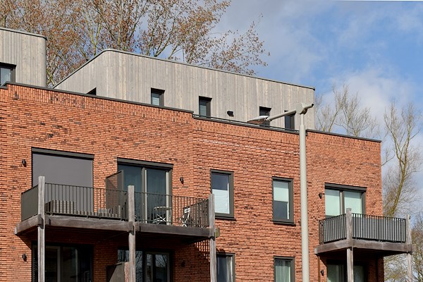 De architectuur van Sluiseiland kenmerkt zich door een heldere opbouw en een krachtig materiaalgebruik. Bij een groot aantal woningen is gekozen voor Vuré Noir® gevelbekleding, toegepast in de bovenste bouwdelen. Deze toepassing zorgt voor een duidelijke gelaagdheid in het gevelbeeld en geeft de woningen een moderne, robuuste uitstraling, terwijl de natuurlijke houtstructuur zorgt voor warmte en verfijning.